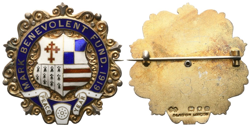 Spilla Mark Benevolent Fund. 1919, "Peace Year", AG E Smalti (37,5 mm)