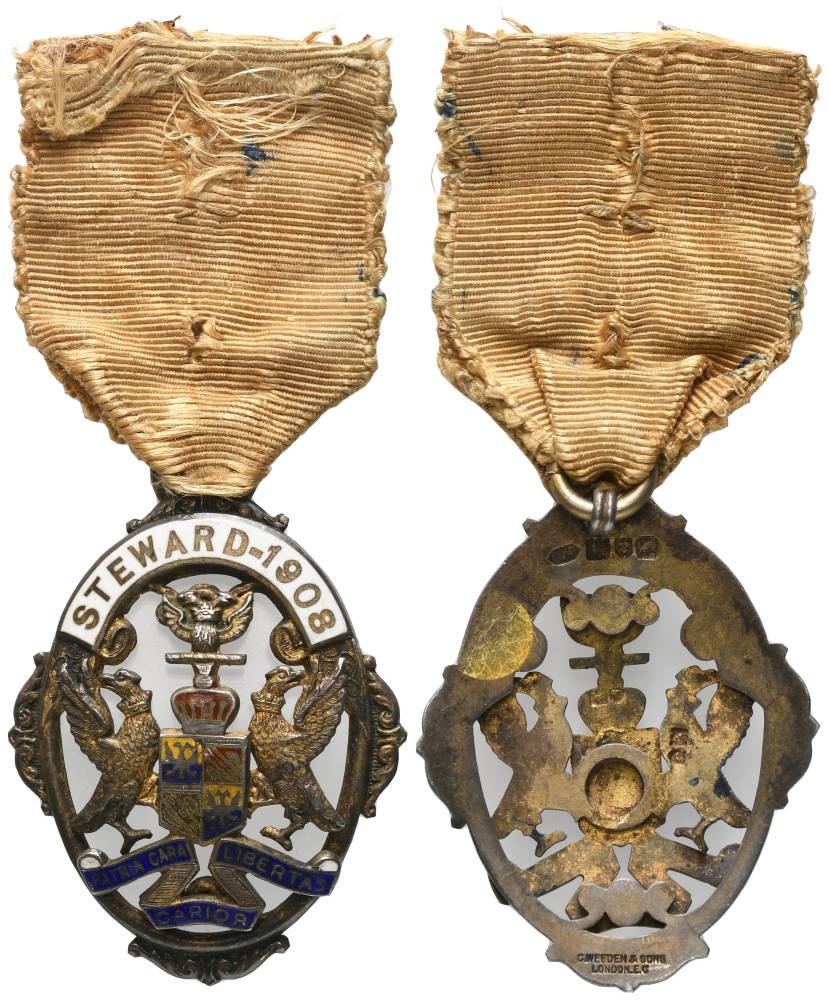 Medaglia STEWARD - 1908, "Patria Cara Carior Libertas", AG E Smalti (34 x 44 mm)