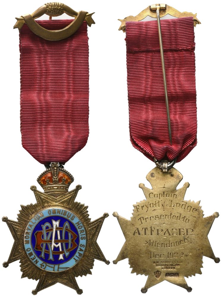 Captain Fryatt Lodge. presented To A. T. Fraser Attendance Dec. 1924. Peso: 34,80 g.