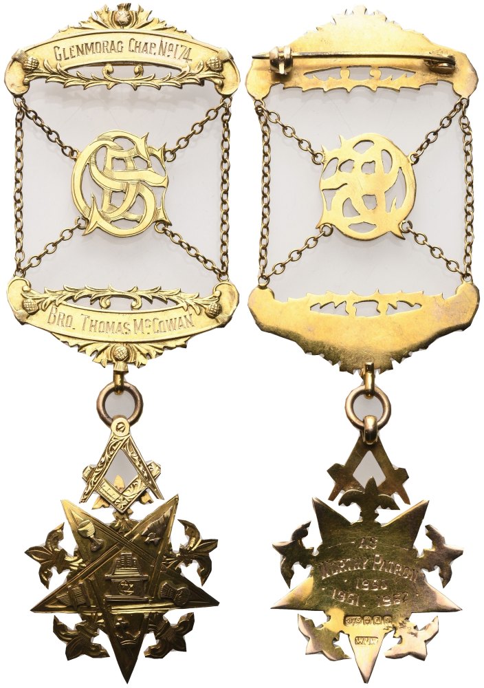 Spilla Con Medaglia Interamente In Oro "Glenmorag Chap. N° 174", Bro. Thomas McCowan, 1962 (34,7 x 99,5 mm)