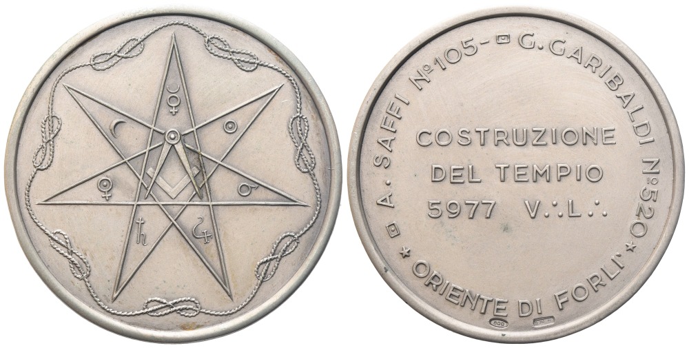 Medaglia A. Saffi N° 105 - G. Garibaldi N° 520, Oriente Di Forlì, Costruzione Del Tempio 5977 V. L., AG (44,8 mm)