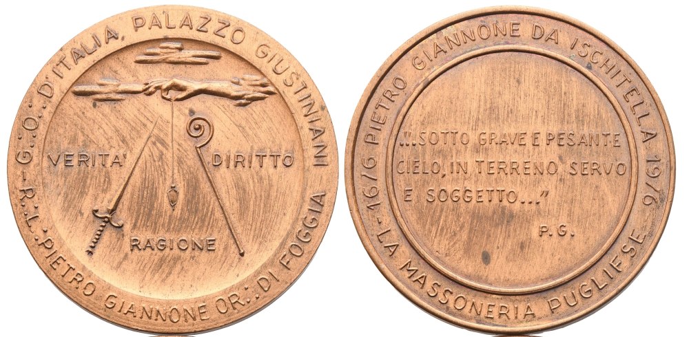Medaglia R. L. "Pietro Giannone" Or. Di Foggia, G. O. D'Italia Palazzo Giustiniani (35,5 mm)