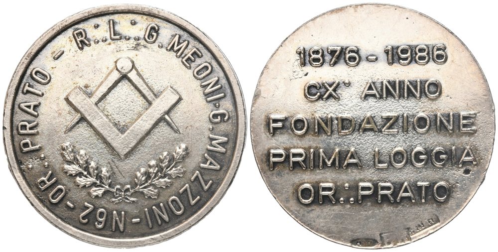Lotto 169 | Medaglia CX° Anno Fondazione Prima Loggia Or. Prato, 1986, AG (39,8 mm)