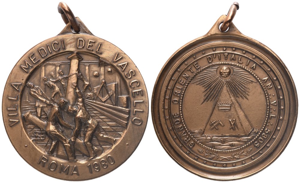 Medaglia dedicata alla sede del Grande Oriente d’Italia, già centro dell’ultima difesa della Repubblica Romana (1849).    La medaglia è firmata con monogramma "NS".