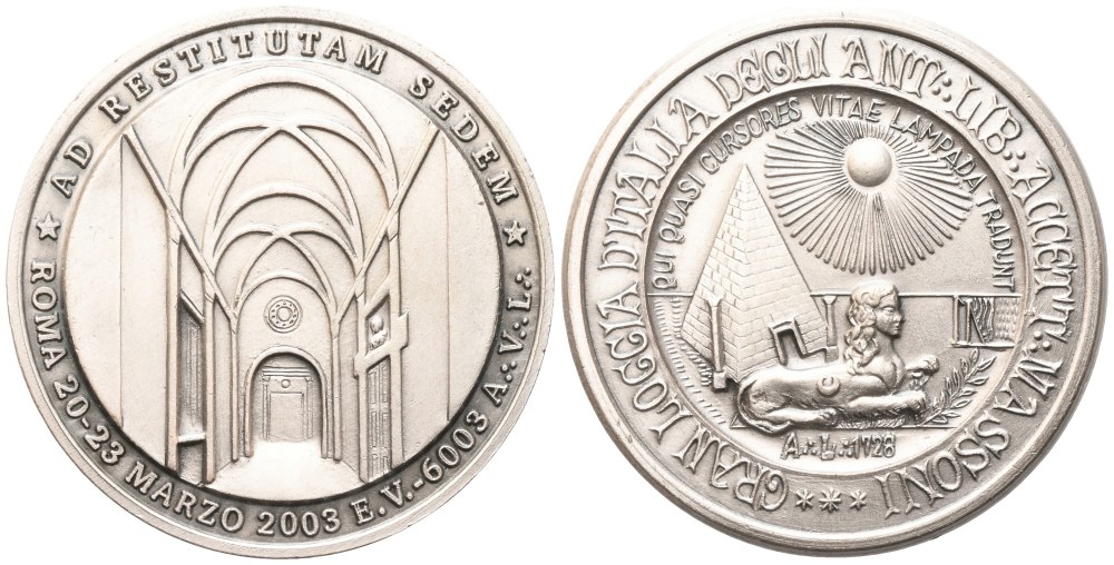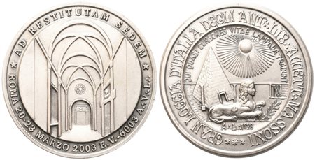 Lotto 228 | Medaglia Gran Loggia D'Italia Degli Ant. Lib. Accett. Massoni, "Ad Restitutam Sedem", Roma 20 - 23 Marzo 2003 (50,5mm)
