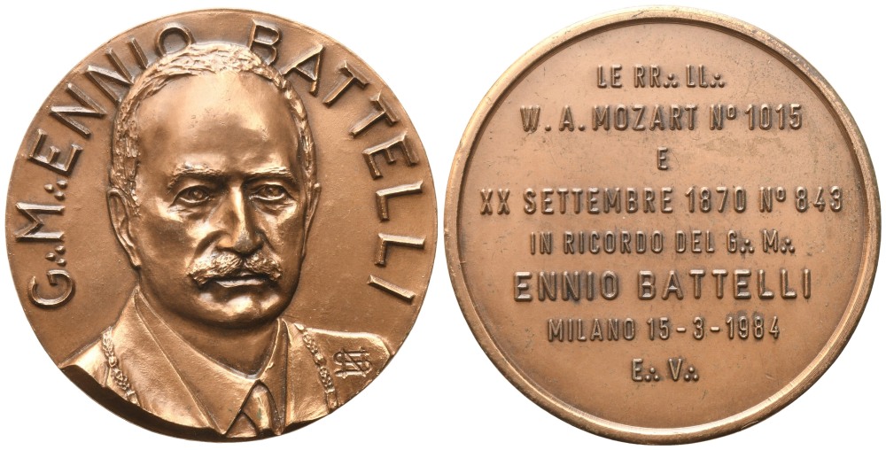 Dedicata al generale d’aereonautica Ennio Battelli (1919-1984), Gran Maestro del G.O.I. dal 1978 al 1982. La medaglia è firmata con monogramma "NS".