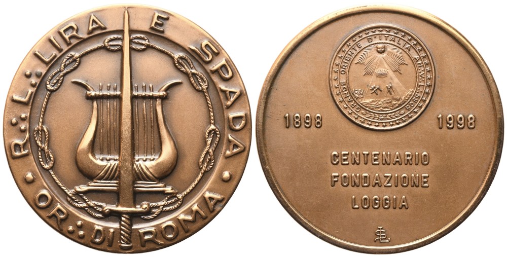 Medaglia R. L. "Lira E Spada" Or. Di Roma, Centenario Fondazione Loggia 1898 - 1998 (51,4 mm)