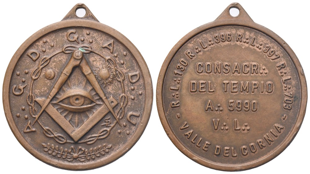 Medaglia R. L. 130 - R. L. 396 - R. L. 397 - R. L. 703 - Valle Del Cornia, Consacr. Del Tempio A. 5990 V. L. (36 mm)