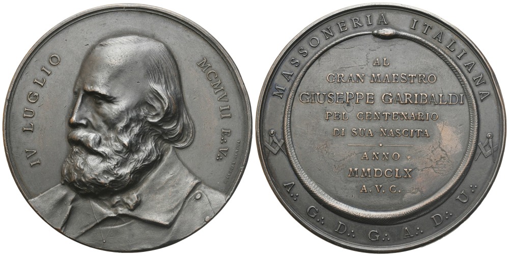 Lotto 296 | Medaglia Massoneria Italiana, Al Gran Maestro Giuseppe Garibaldi Pel Centenario Di Sua Nascita (55 mm)