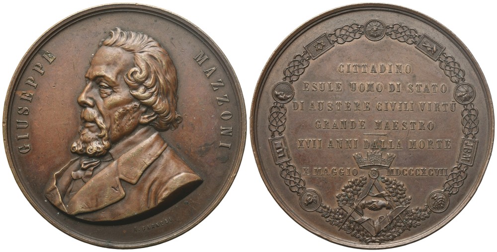 Medaglia in bronzo coniata nel 1897 in occasione dell’inaugurazione del monumento eretto a Prato in onore di Giuseppe Mazzoni Triumviro della Toscana e Gran Maestro della Massoneria italiana per circa dieci anni.