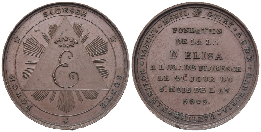 È la medaglia emessa in memoria dell’innalzamento delle colonne della Loggia Elisa di Firenze nel 1809.    Al dritto: su sette righe la legenda “FONDATION DE LA L D’ELISA A L’OR  DE FLORENCE LE 21. JOUR DU 5. MOIS DE L’AN 5809.”; dentro al contorno, a cornice, al centro in alto stella a cinque punte con inscritta la lettera “G” e a seguire da sinistra GOURY * AUDE * GABBORIA * GAUTIER * MARMILOR * BARONI * MENIL (probabilmente i Fratelli fondatori).    Al rovescio: grande triangolo raggiante con iscritta la lettera “E” sormontata da una corona di nove stelle a cinque punte; dentro al contorno a cornice al centro in alto SAGESSE a destra BONTE a sinistra FORCE con tre stelle a cinque punte a dividere.    Con l’avvento napoleonico e l’annessione della Toscana all’Impero francese fu fondata, il 21 Luglio del 1809 la Loggia Elisa, intitolata alla neonominata Granduchessa di Toscana Elisa Bonaparte Baciocchi (Ajaccio 3 Gennaio 1777 – Trieste 7 Agosto 1820) in ossequio all’abitudine dell’epoca di intitolare le Logge a Napoleone ovvero ai suoi familiari.