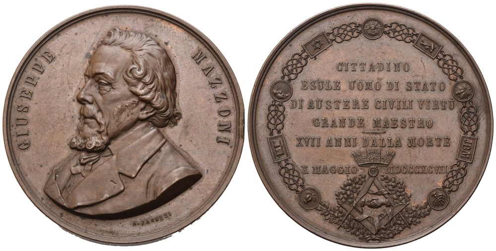 Medaglia in bronzo coniata nel 1897 in occasione dell’inaugurazione del monumento eretto a Prato in onore di Giuseppe Mazzoni Triumviro della Toscana e Gran Maestro della Massoneria italiana per circa dieci anni.