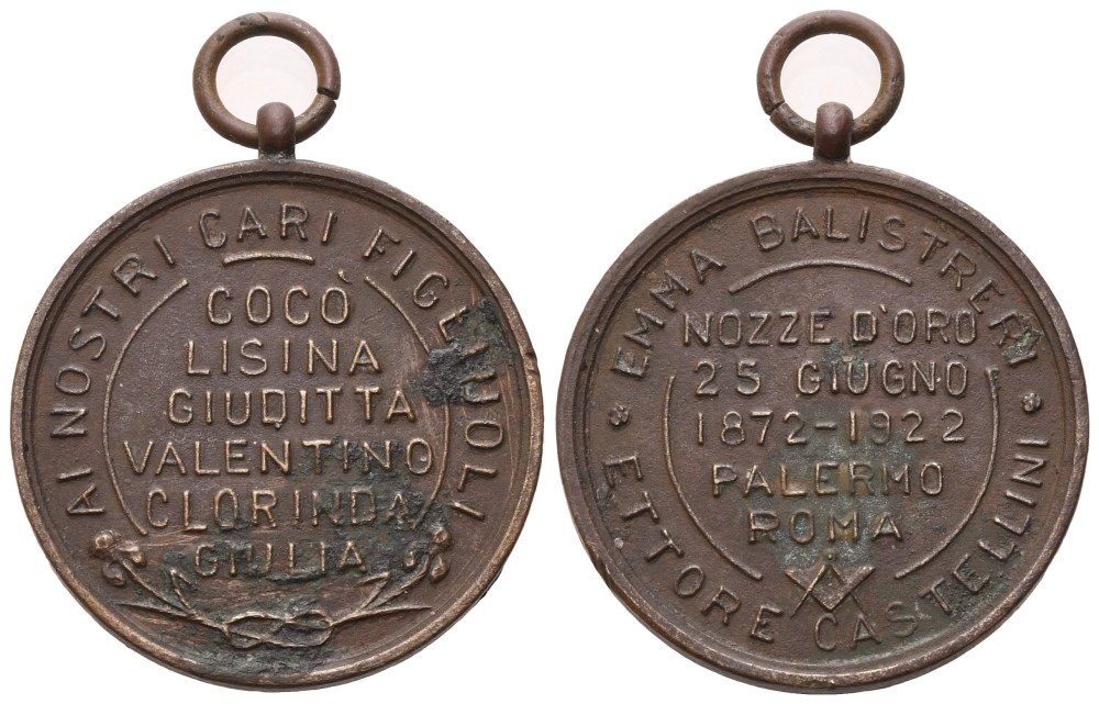 Peso: 28,29 g. Medaglia coniata in occasione delle Nozze d’Oro di Ettore Castellini con la moglie Emma Balistreri il 25 Giugno 1922 e dedicata ai sei figli Cocò, Lisina, Giuditta, Valentino, Clorinda e Giulia. La presenza sul recto di squadra e compasso intrecciati fa pensare che il Castellini fosse Massone.