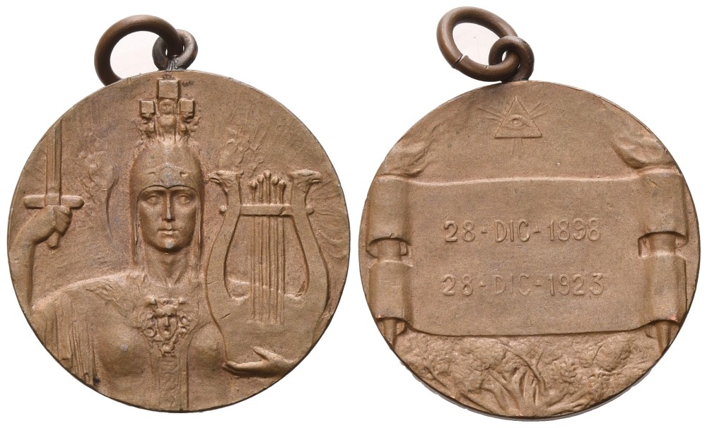 Rovescio: in alto triangolo raggiante con occhio al centro, cartiglio, riportante su due righe le date 28 DIC 1898| 28 DIC 1923. Con appiccagnolo.