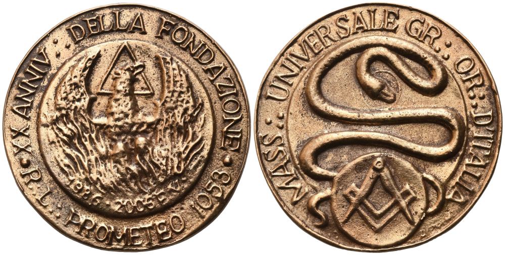 Medaglia Mass. Universale Gr. Or. D'Italia, R. L. "Prometeo" 1053, XX Anniv. Della Fondazione 1986 - 2006 E. V. (46,9 mm)