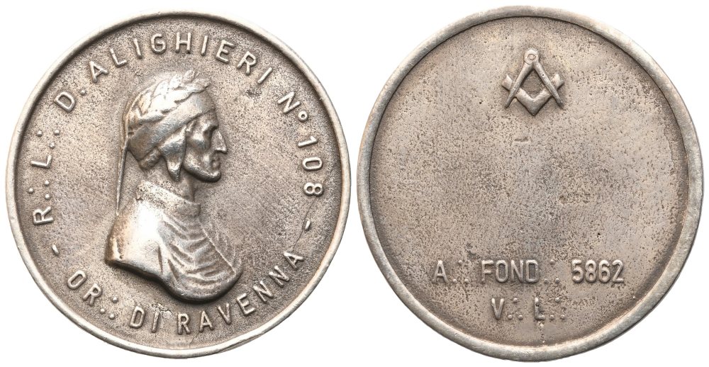 Medaglia R. L. "Dante Alighieri" N° 108, Or. Di Ravenna, A. Fond. 5862 V. L. (33,8 mm)