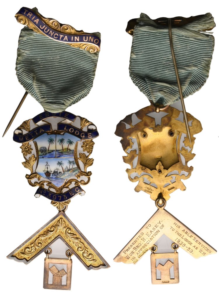 Presented To Wor. Bro. R. Easey In Appreciation Of His Able Services To The Lodge As W. M. 1938 - 39. Peso: 34,90 g. Gioiello di ringraziamento offerto dai Fratelli di loggia per il sevizio prestato come Maestro Venerabile.