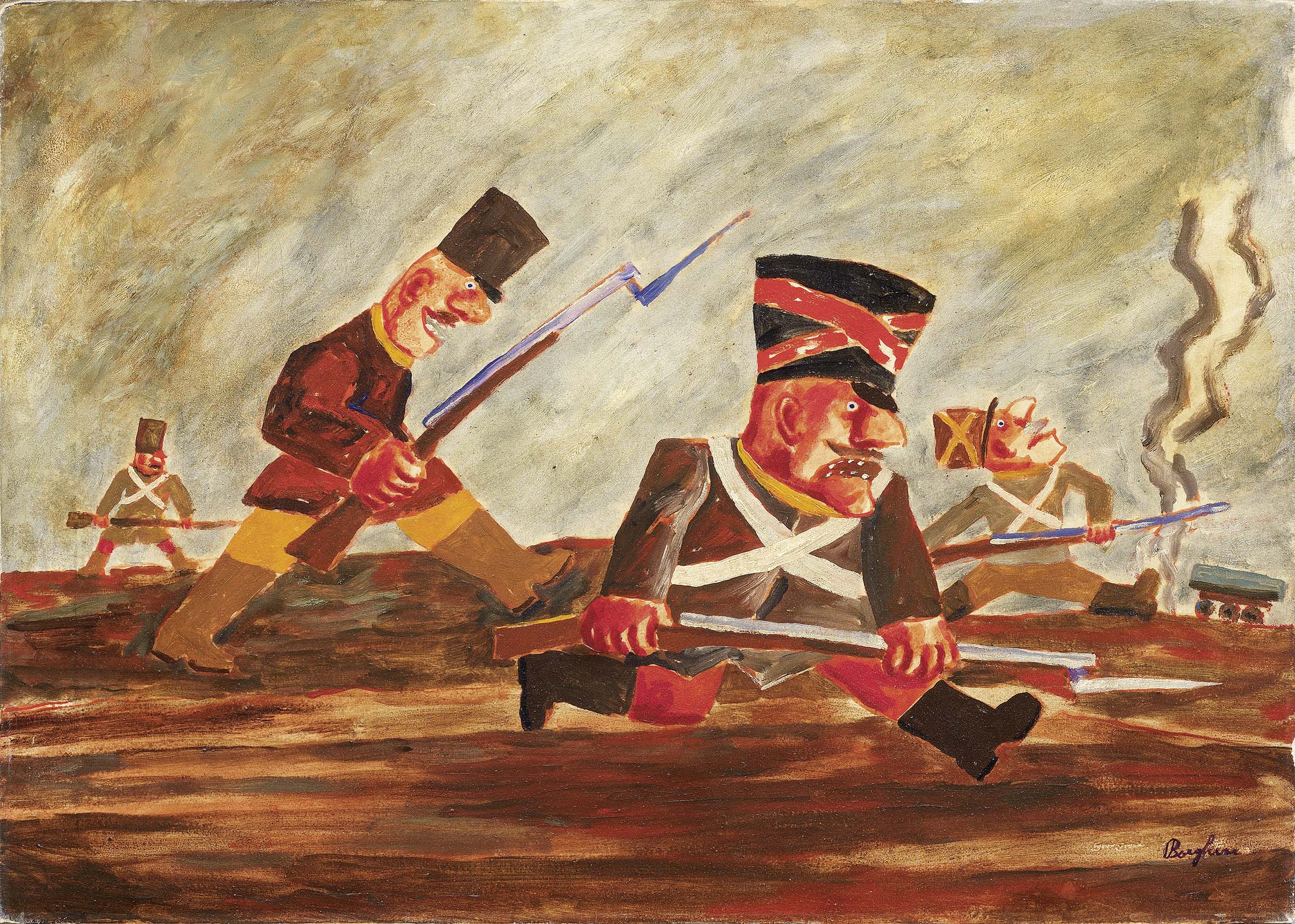 Franz Borghese Roma 1941 - 2005 Alla baionetta, fine anni Ottanta Olio su tela, cm. 50x70 Firma in basso a destra e al verso sulla tela: Borghese. Foto autenticata dall’artista, con n. L7TM049053993; lettera dell’artista con dati dell’opera.