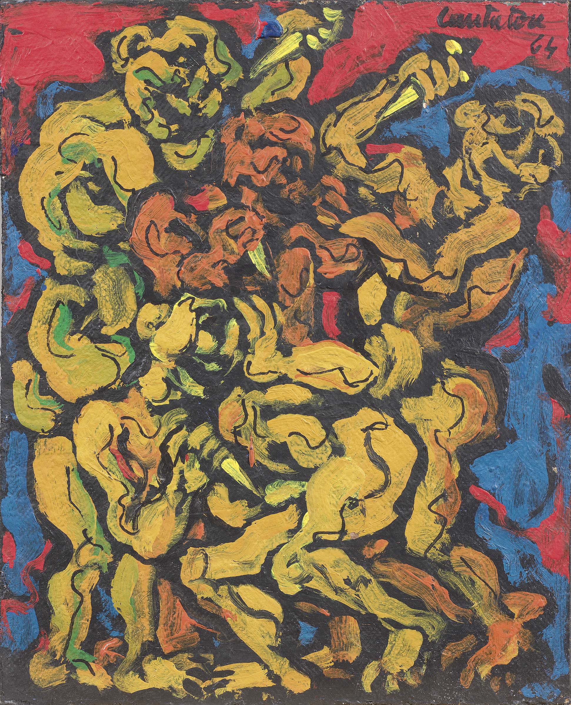 Domenico Cantatore Ruvo di Puglia (Ba) 1906 - Parigi 1998 Battaglia, 1964 Olio su cartone pressato, cm. 34x27 Firma e data in alto a destra: Cantatore / 64; firma, titolo e data al verso: Domenico Cantatore / “Battaglia” / 1964.
