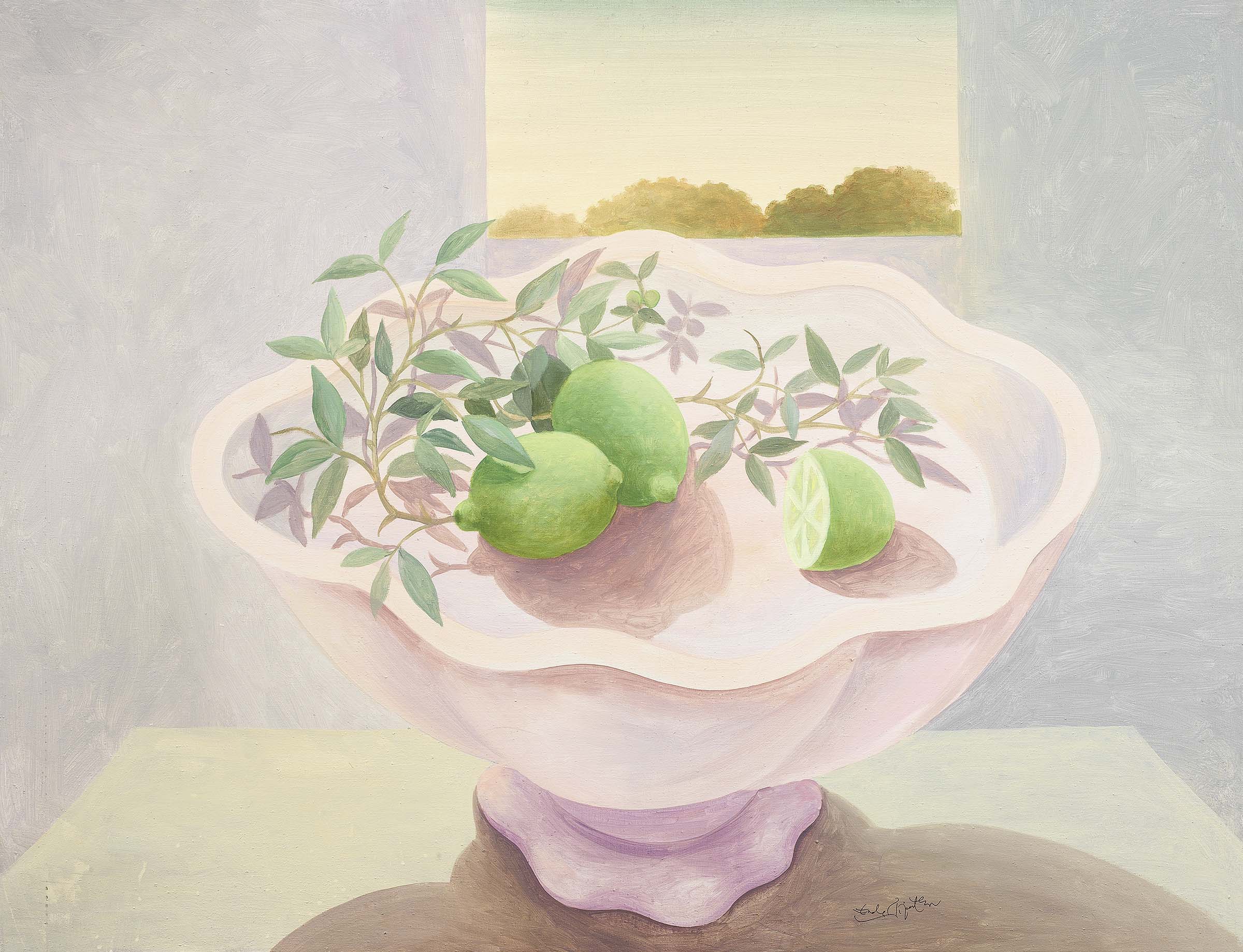 Ercole Pignatelli Lecce 1935 Fruttiera con limoni, 1984 Olio su tela, cm. 89,4x116,5 Firma in basso al centro: Ercole Pignatelli; firma, titolo e data al verso sulla tela: Ercole Pignatelli / “Fruttiera con limoni” / 1984. Foto autenticata dall’artista, in data 30.6.84.