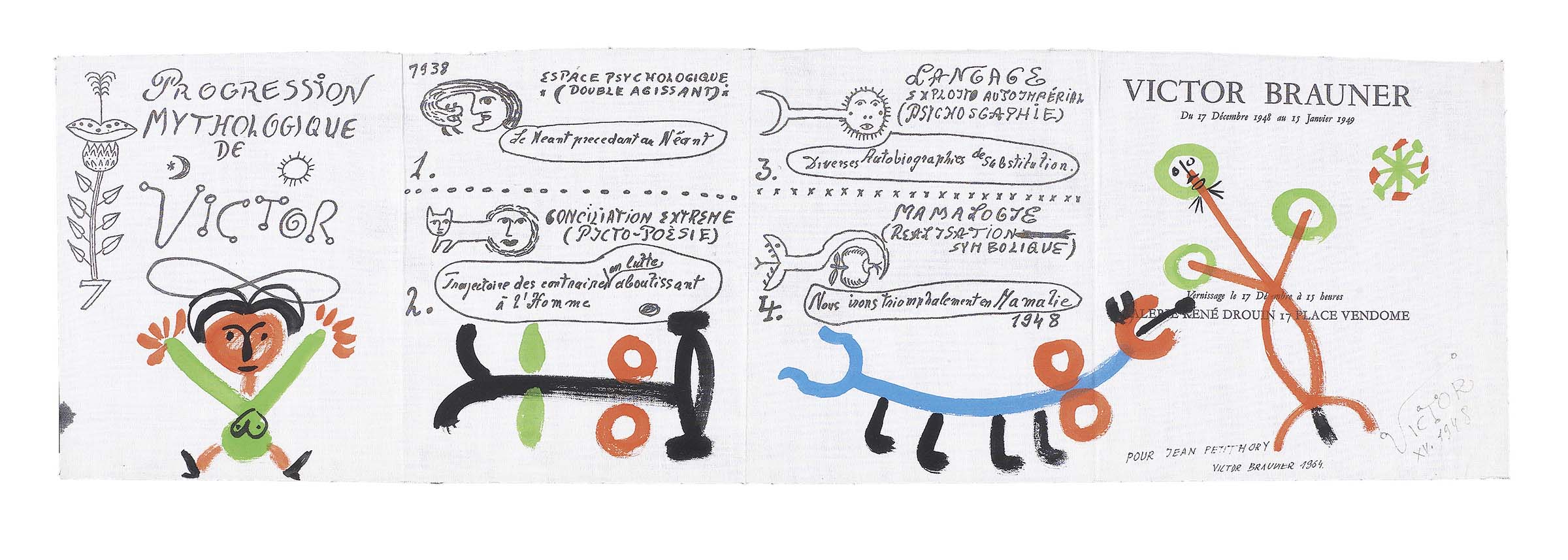 Victor Brauner Piatra-Naemtz 1903 - Parigi 1966 Progression Mythologique de Victor, 1948 Tempera su invito di mostra stampato su stoffa, cm. 20x67,5 Firma e data in basso a destra: Victor / XV.1948. Al verso su un pannello di supporto: timbro Alfred Kuber, Zurigo. Biglietto realizzato in occasione della mostra Victor Brauner, Parigi, Galerie René Drouin, 17 dicembre 1948 - 25 gennaio 1949.