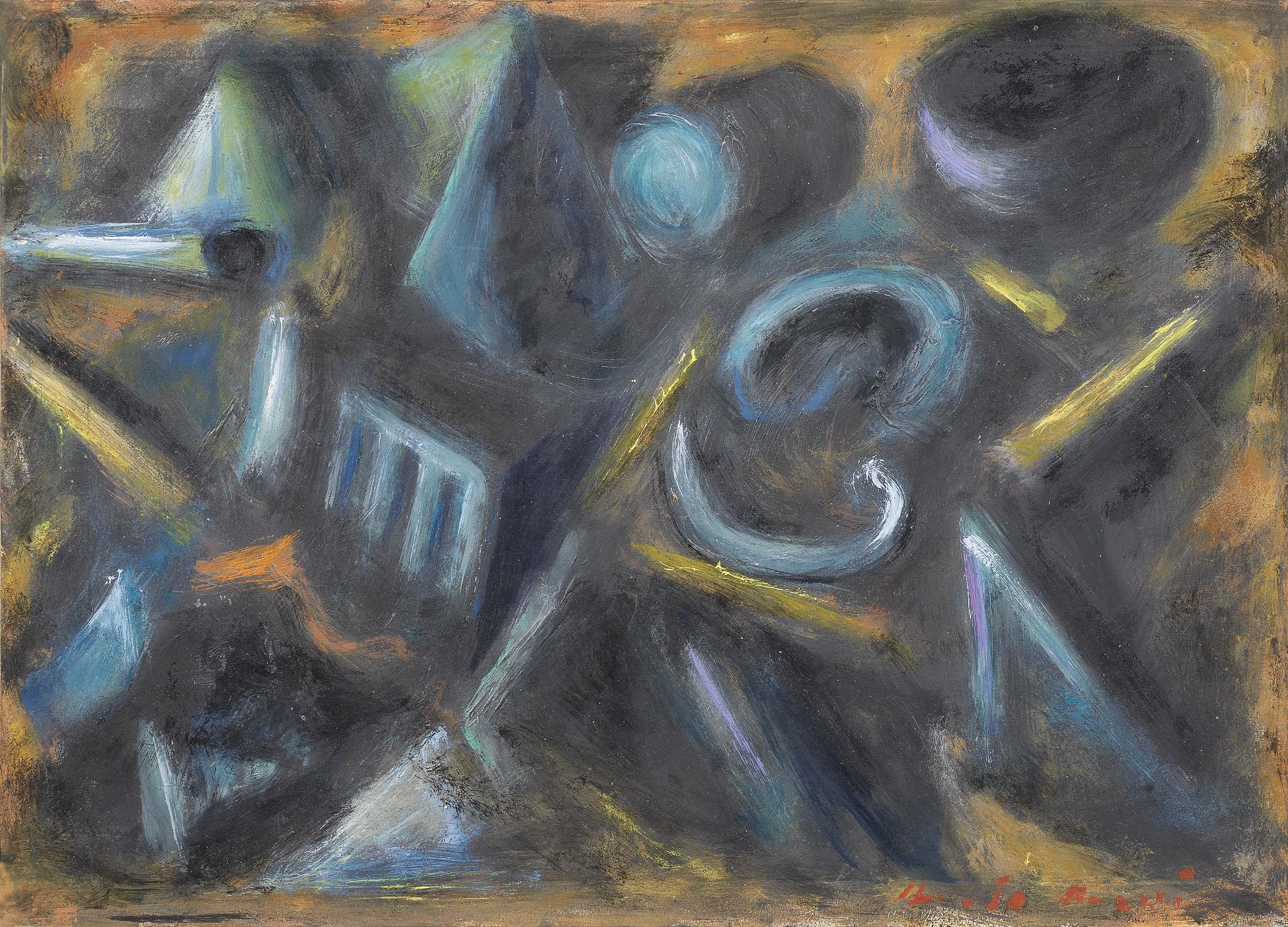 Roberto Barni Pistoia 1939 Geometrie domestiche, 1981 Olio su carta applicata su tela, cm. 50x69,5 Firma in basso a destra: Roberto Barni; firma, data e titolo al verso: Roberto Barni / 1981 / Geometrie domestiche.