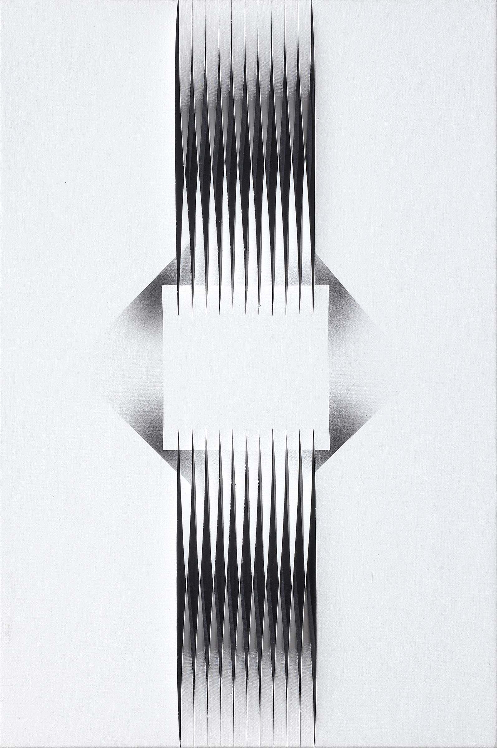 Alberto Biasi Padova 1937 Monumentale, 2000 Tecnica mista su tela, cm. 45x30 Firma, data e titolo al verso sulla tela: Alberto Biasi / 2000 / “Monumentale”: etichetta Città di Finale Ligure / Chiostri di Santa Caterina / maggio 2004.