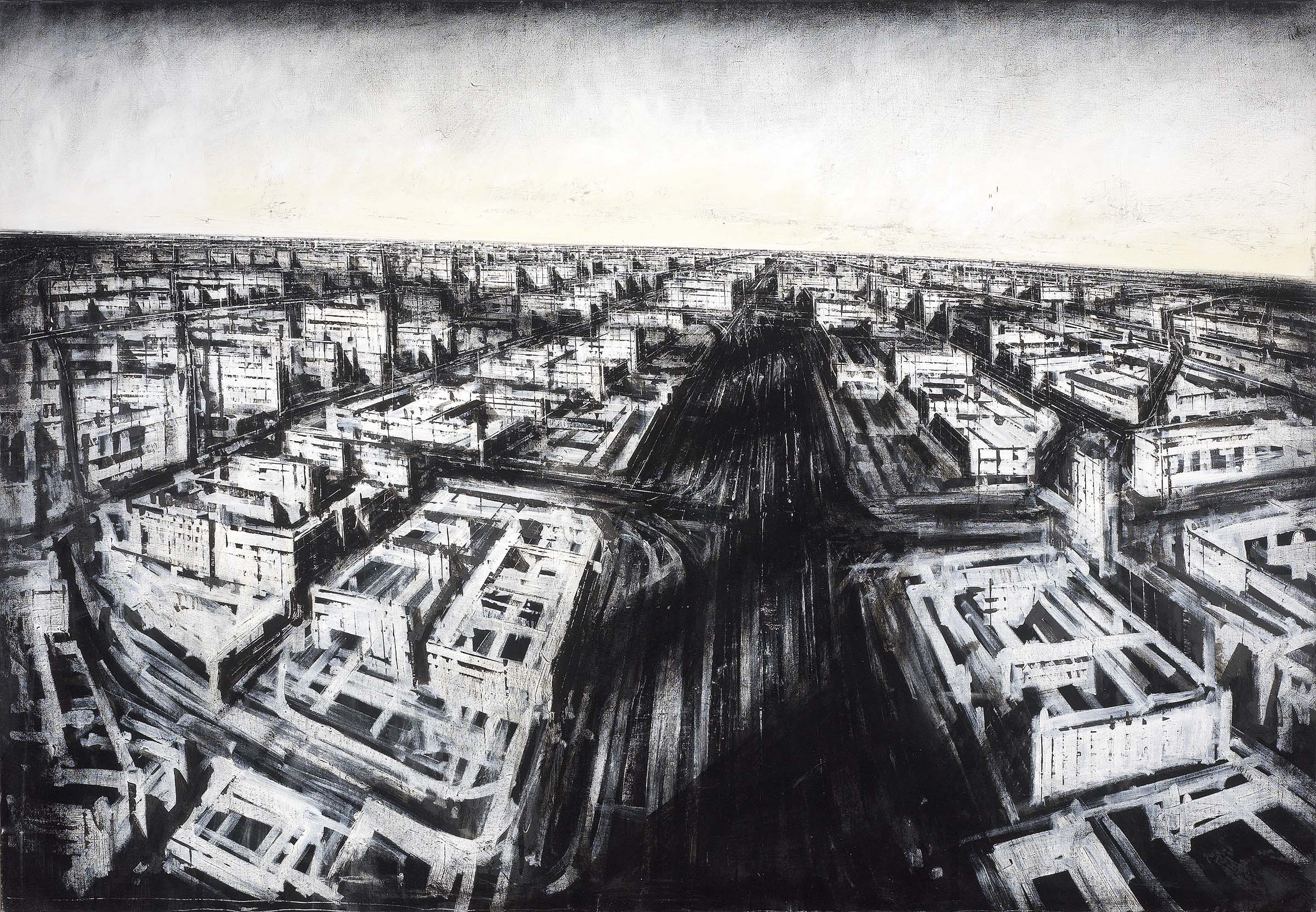 Jonathan Guaitamacchi Londra 1961 Strada centrale, 2001 Olio su tela, cm. 90x130 Firma e data al verso sulla tela: Jonathan Guaitamacchi / 2001; firma, data e titolo sul telaio: Jonathan Guaitamacchi 2001 “Strada centrale”.