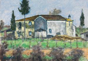 Ardengo Soffici Rignano sull'Arno (Fi) 1879 - Vittoria Apuana (Lu) 1964 La casa del Berna, 1963 Olio su cartone telato, cm. 34,7x49,6 Firma in basso a sinistra: Soffici. Al verso: cartiglio con scritta Paese / (Casa del Berna) / 14 (a inchiostro): etichet- ta Il Castello Galleria d'Arte, Milano (opera datata 1955): due timbri Galleria d'Arte Moderna Il Castello / Milano. Storia: Famiglia Soffici, Poggio a Caiano; Collezione pri- vata Esposizioni: Ardengo Soffici. L'artista e lo scrittore nella cultura del 900, Poggio a Caiano, Villa Medicea, 1 - 30 giugno 1975, cat. n. 88, illustrato; Ardengo Soffici, oli, acquarelli, disegni, Focette, Galleria Farsetti, 4 agosto - 9 settembre 1979, cat. n. 33, illustrato. Bibliografia: Giuseppe Raimondi, Luigi Cavallo, Ardengo Soffici, Nuovedizioni Enrico Vallecchi, Firenze, 1967, p. 100, tav. CCCLXV, n. 609.