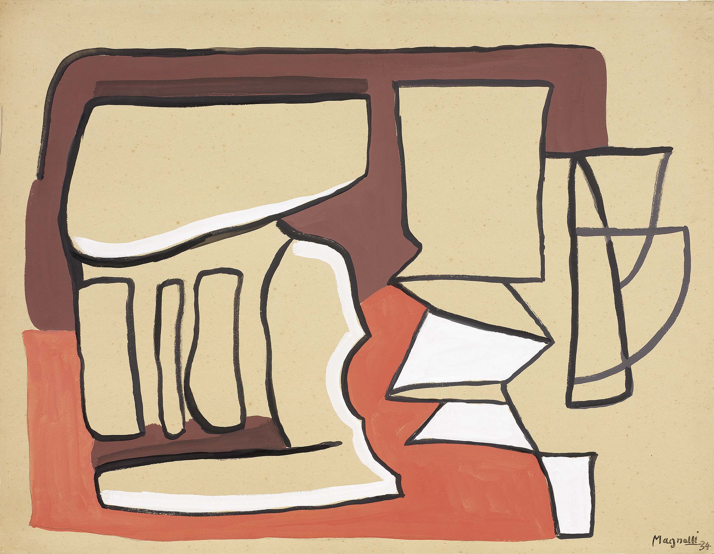 Alberto Magnelli Firenze 1888 - Meudon 1971 Composizione, 1934 Tempera su cartone, cm. 47,5x61 Firma e data in basso a destra: Magnelli 34; firma e data al verso: (N. 3) / Alberto Magnelli / Paris 1934. Al verso, su un cartone di supporto: etichetta GalleriaUno. Certificato su foto di Susi Magnelli, Meudon 16-12-87; certificato su foto GalleriaUno ex GoriziArte. Esposizioni: Alberto Magnelli, da Firenze a Parigi, Reggio Emilia, Palazzo Magnani e Correggio, Palazzo dei Priori, 16 dicembre 2006 - 11 marzo 2007, cat. p. 228.