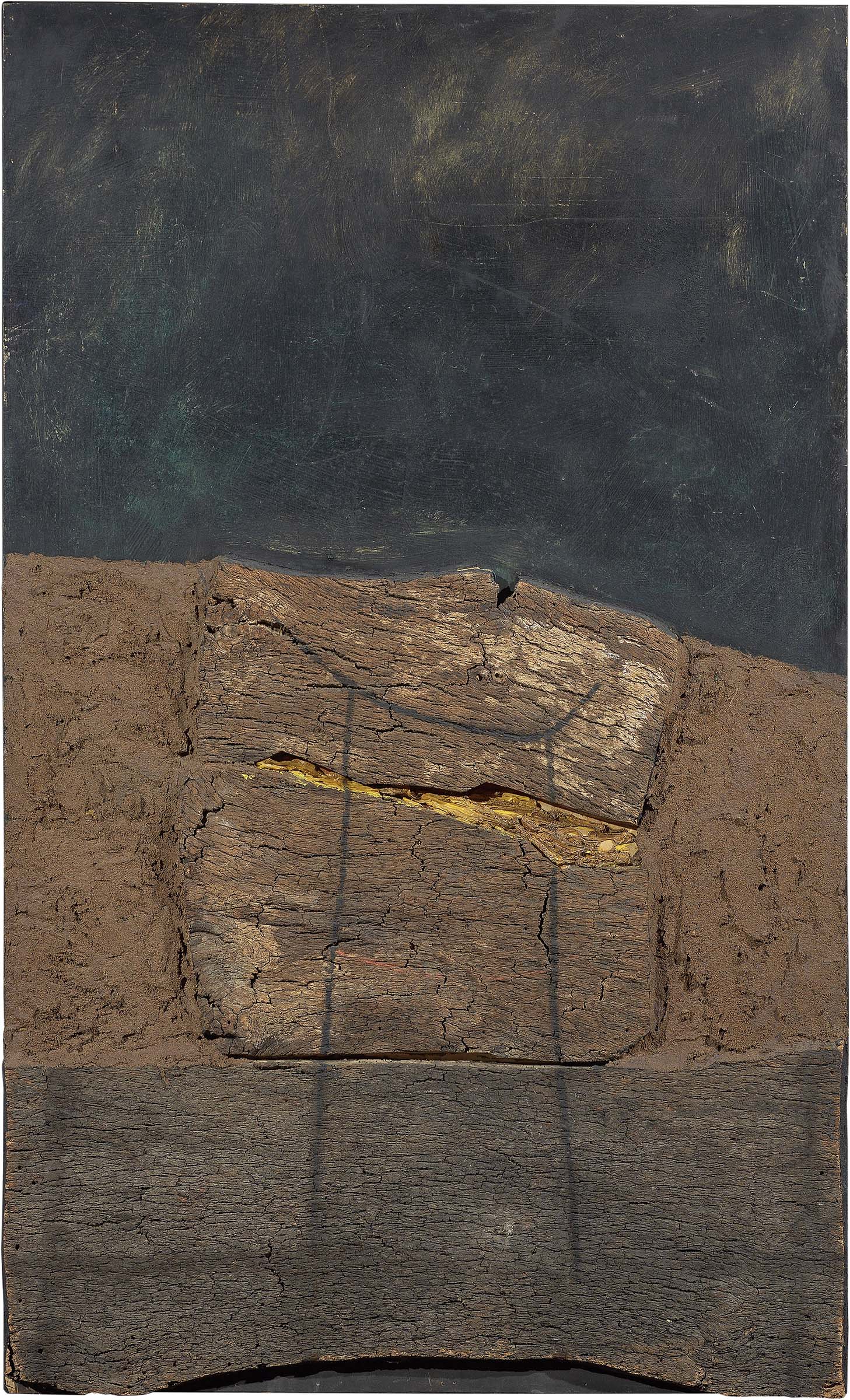 Roberto Crippa Milano 1921 - Bresso (Mi) 1972 Senza titolo, 1959 Collage, olio e sughero su tavola, cm. 165x100 Firma e data al verso: R. Crippa 59. Certificato su foto di Roberto Crippa jr., con n. ADN O/X/XXVIII/01.