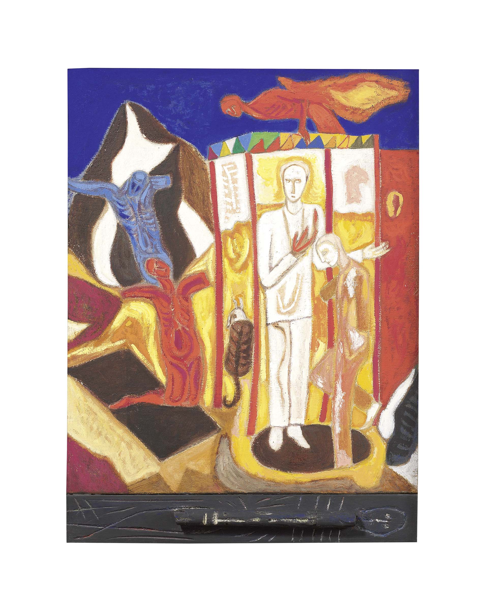 Mimmo Paladino Paduli (Bn) 1948 Composizione, 1983 Olio su tela e legno, cm. 68,5x50,5 Firma e data al verso sulla tela: M. Paladino / 1983; sul telaio: tre timbri Galleria d’Arte Moderna / Emilio Mazzoli / Modena: etichetta Gian Enzo Sperone, Roma.