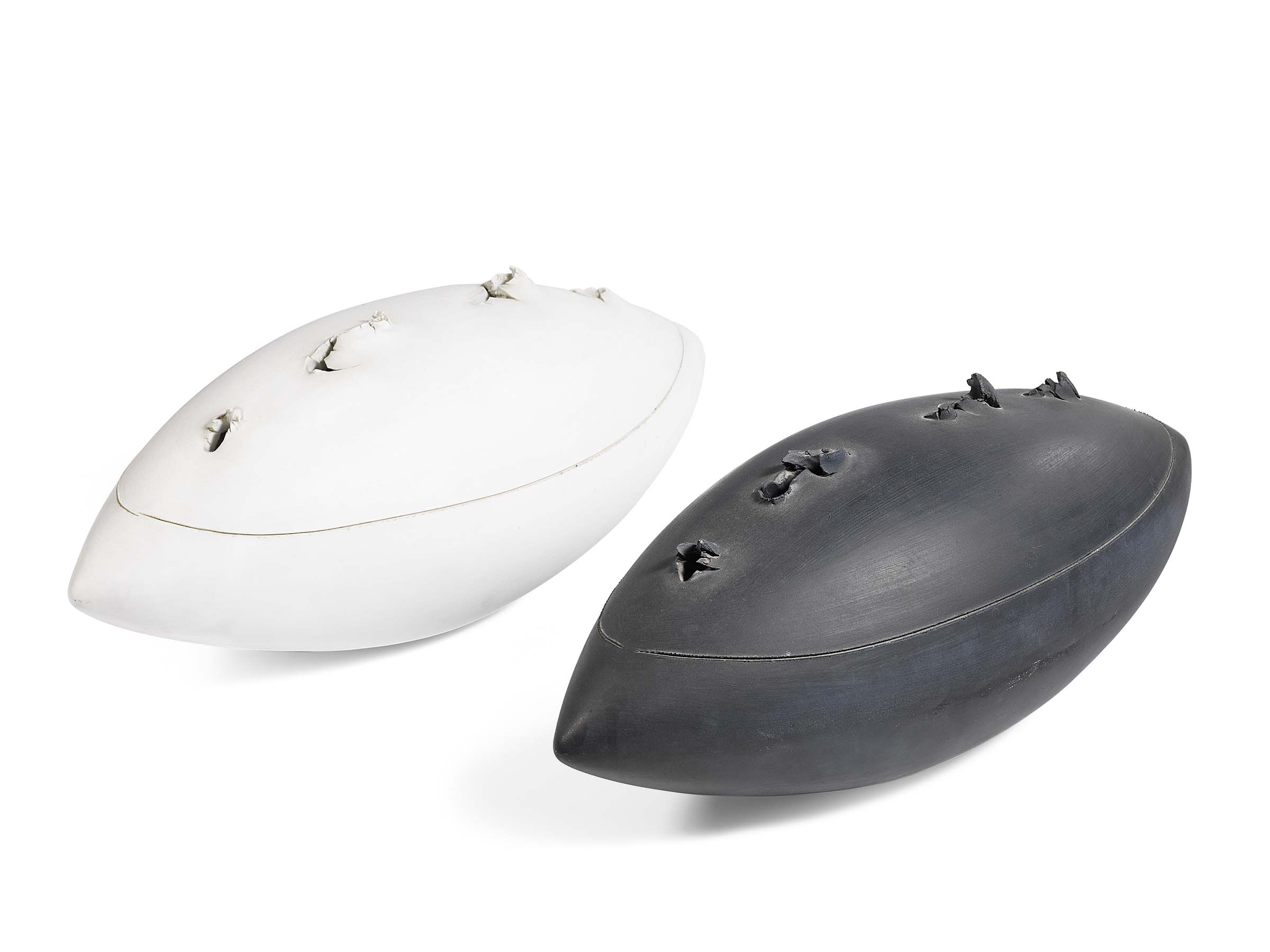 Lucio Fontana Rosario Santa Fè 1899 - Varese 1968 Concetto Spaziale Ovale, 1968 Sculture in porcellana bianca e porcellana nera, es. 16/75 (bianca), es. 10/75 (nera), cm. 17,5x44x18 ognuna Firma e tiratura sotto la base: L. Fontana / 16/75 (bianca) e L. Fontana / 10/75 (nera), entro targhetta Arts Porcellana / Rosenthal Relief Reihe. Opera realizzata in 75 esemplari in porcellana bianca e 75 esemplari in porcellana nera, manifattura Rosenthal, 1968. Bibliografia: Camillo Rigo, Harry Ruhé, Lucio Fontana, incisioni, grafica, multipli, pubblicazioni..., Reverdito Edizioni, Trento, 2007, p. 141, n. C-1.