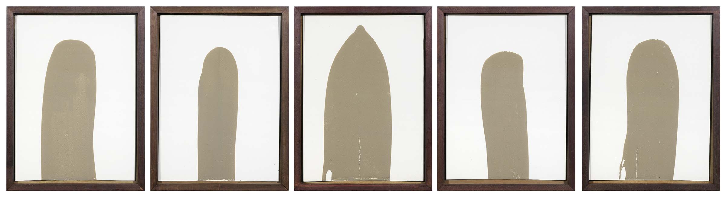 Richard Long Bristol 1945 River Avon Mud Drawings, 1984 Tecnica mista su carta, opera composta da cinque elementi, cm. 50x36 ognuno Al verso sulla tavola di ogni elemento: etichetta NewArtCentre, Salisbury, Wiltshire. Foto autenticata dall’artista, in data 10-4-09.
