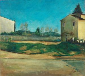 Achille Lega Brisighella (Ra) 1899 - Firenze 1934 Paesaggio, 1921 Olio su tela, cm. 45,3x50 Firma e data in basso a destra: A. Lega 1921; titolo al ver- so, sulla tela e sul telaio: Paesaggio; sul telaio: etichetta Arte Moderna in Italia / 1915 - 1935 / Mostra in Palazzo Strozzi / Firenze / Novembre 1966 - Febbraio 1967, con n. 1032. Esposizioni: Arte Moderna in Italia 1915-1935, Firenze, Palazzo Strozzi, 26 febbraio - 28 maggio 1967, cat. pp. XXV, 123, n. 572, illustrato.