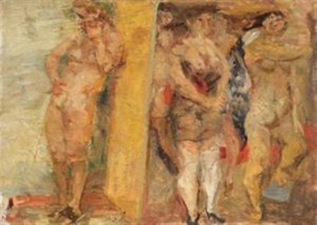 Fausto Pirandello Roma 1899 - 1975 Bagnanti, 1943 ca. Olio su tavola, cm. 37,5x52,5 Firma in basso a sinistra: Pirandello. Al verso: etichetta e timbro Studio d'Arte Campaiola, Roma: timbro Galleria d'arte "Campaiola", Roma: timbro Galleria Gissi, Torino, con n. 4888. Certificato su foto di Claudia Gian Ferrari, Milano, 28 maggio 2001. Bibliografia: Claudia Gian Ferrari, Fausto Pirandello. Catalogo Generale, Mondadori Electa, Milano, 2009, pp. 140, 141, n. 277.
