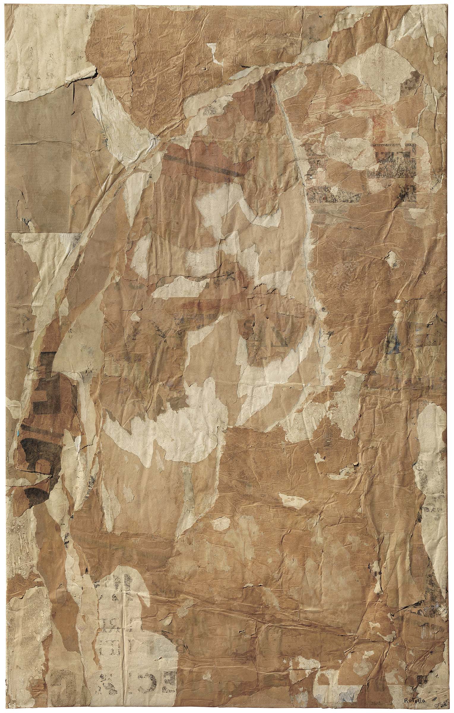 Mimmo Rotella Catanzaro 1918 - Milano 2006 Senza titolo, 1958 Retro di affiche su tela, cm. 117,8x72 Firma in basso a destra e al verso sulla tela: Rotella. Foto autenticata dall’artista, Milano, 26 aprile 1995. Bibliografia Alberto Fiz, Mimmo Rotella. Roma Parigi New York, Skira, Milano, 2009, p. 129.