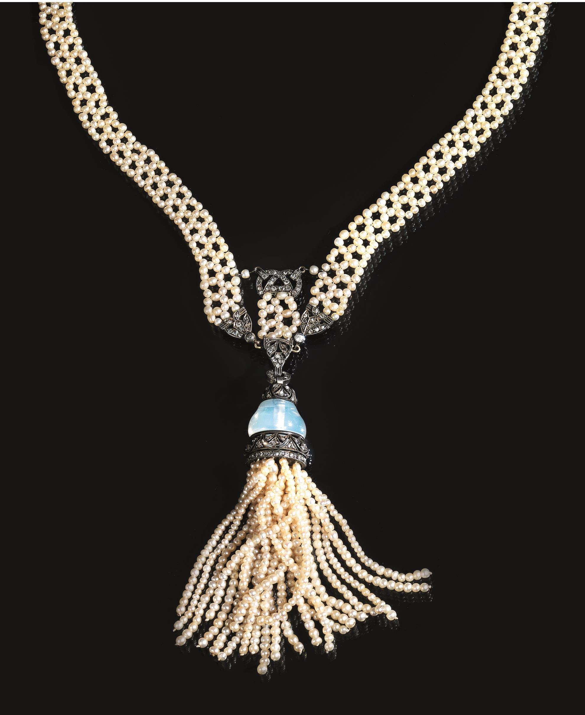 Sautoir, inizi sec. XX, in microperle, argento, diamanti e calcedonio