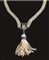 formato da fili intrecciati a formare un nastro in microperle, con elemento centrale in argento e diamanti a cui è sospesa una nappa in calcedonio, diamanti e microperle, fermatura decorata da una rosa di diamante, g 43