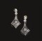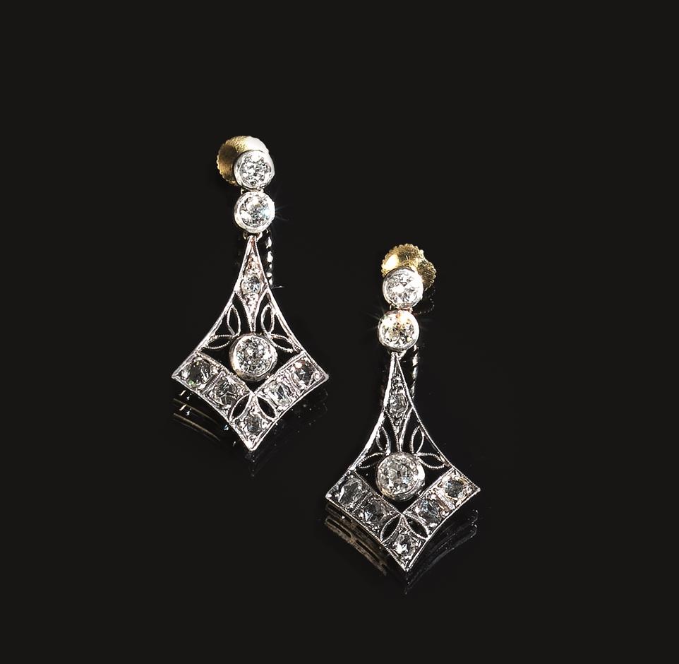 ciascuno realizzato con due brillanti taglio vecchio a cui è sospeso un pendente di forma romboidale sagomata traforata a motivi fogliacei e geometrici impreziosita da rose di diamante, g 6