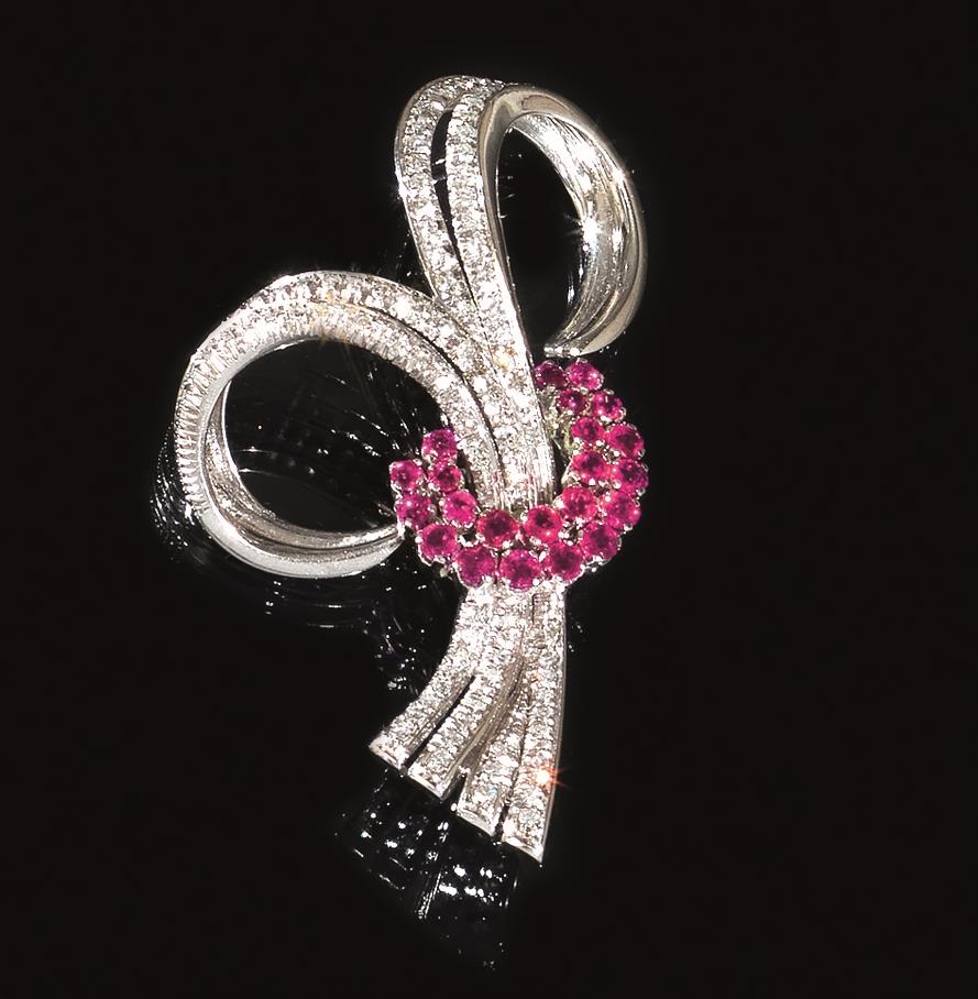Spilla, anni '60, in oro bianco, rubini e diamantimodellata a nastro con...