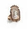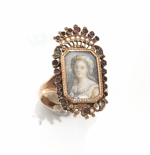 l'anello presenta al centro una miniatura incorniciata da piccole pietre di colore e perle; tre spilloni modellati a ferro di cavallo con perle, pietre e diamanti, uno modellato a pulcino in argento, rose di diamante e rubini, l'altro con miniatura entro cornice di strass, qualche diamante mancante