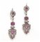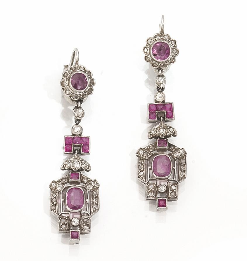 Paio di orecchini pendenti in oro bianco, rubini e diamanti