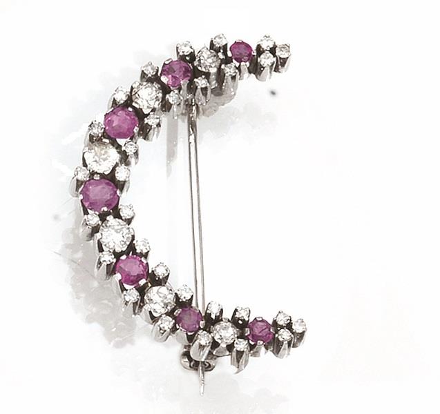 Spilla in oro bianco, diamanti e rubini modellata come una mezzaluna...