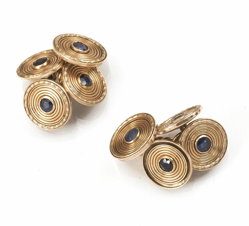 ciascuno realizzato con quattro dischi in oro giallo inciso a solchi, con zaffiro rotondo centrale, g 27