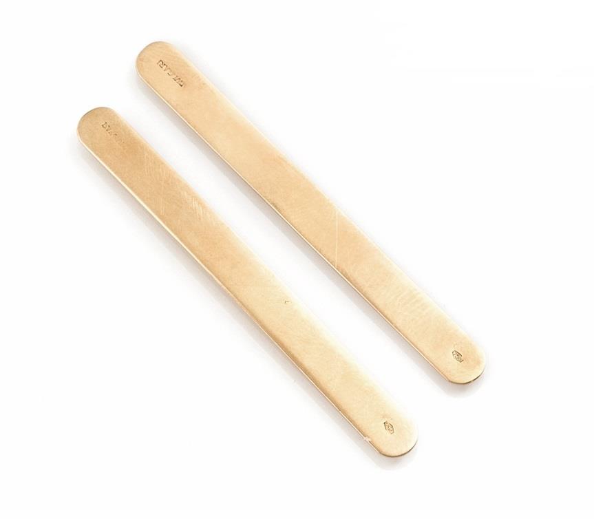 Due paia di gemelli in oro giallo e lapislazzuli e stecche da camicia, Bulgari, in oro giallo un paio di gemelli realizzati con un cabochon ovale in lapislazzuli entro castone in oro giallo; gemelli in oro giallo forma a bottone con monogramma, punzoni 750; due stecche da camicia in oro giallo, punzone Bulgari e 750, g 24 complessivi