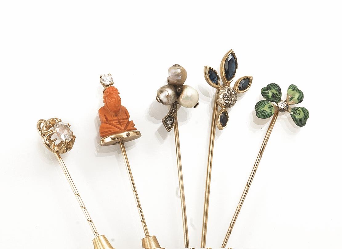 Cinque spilloni da cravatta in oro giallo, oro a basso titolo, metallo placcato, diamanti, pietre di colore, smalti e corallo