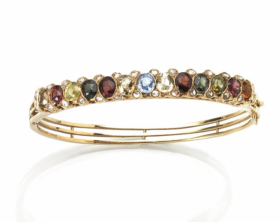 Bracciale in oro giallo e pietre di colorerealizzato come un cerchio rigido a...