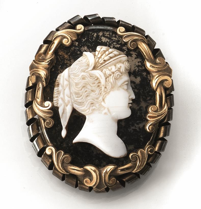 un cammeo di forma ovale con profilo femminile su agata entro cornice decorata a volute; l'altra spilla formata da un calcedonio ovale decorato da un motivo floreale in granati, g 47 complessivi, alcuni danni