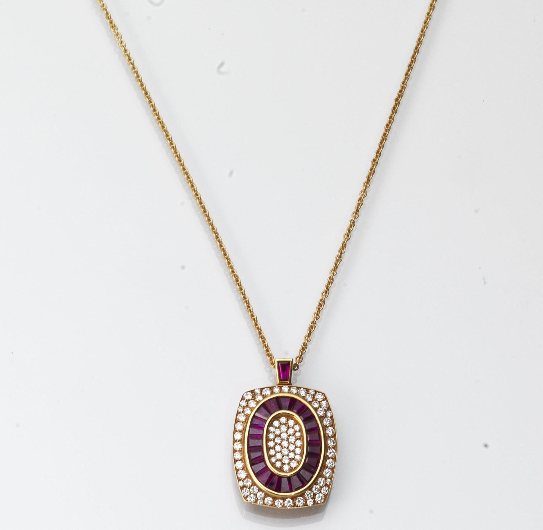 Pendente in oro giallo, rubini e diamantidisegnato come un rettangolo...